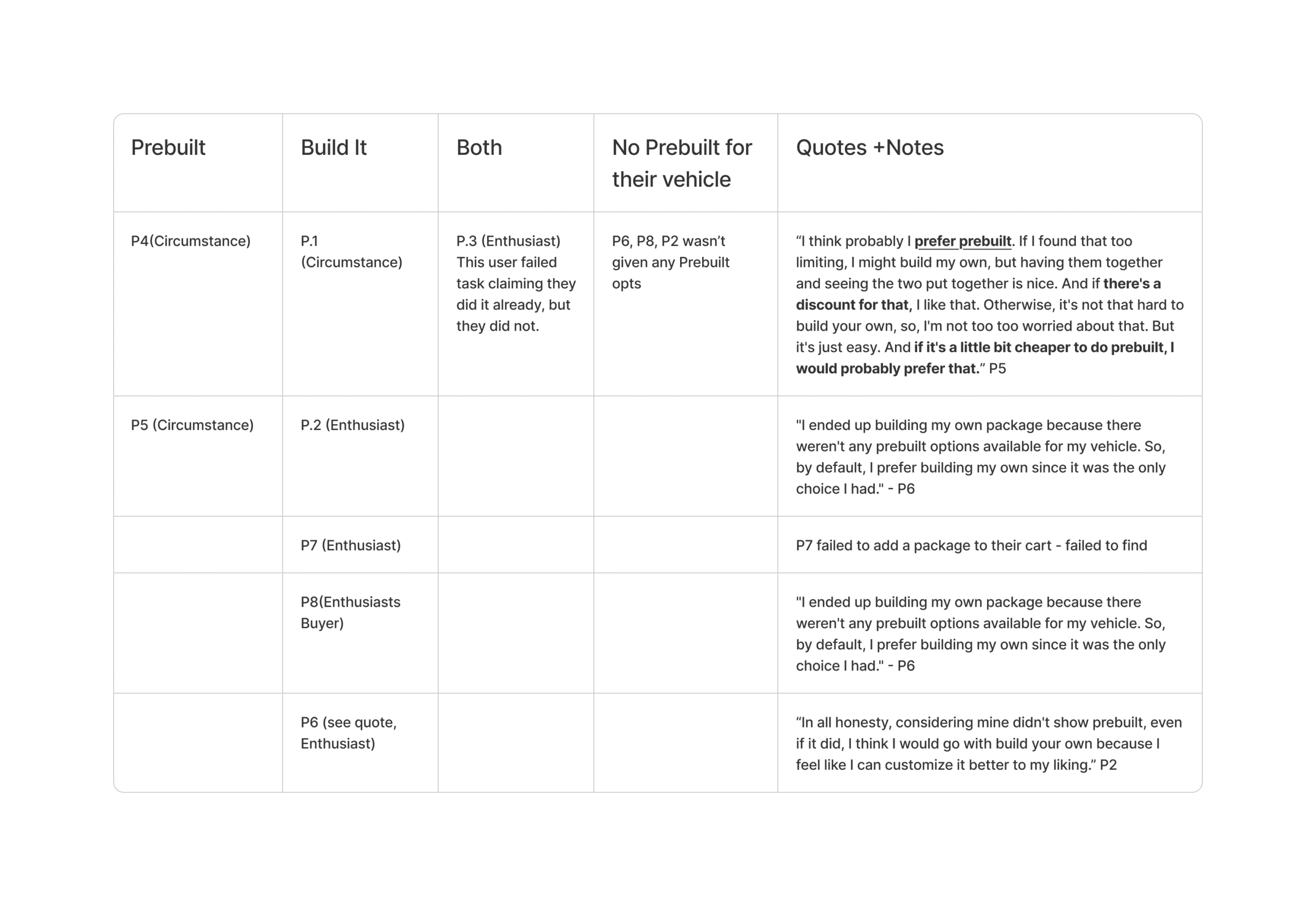 Key improvement areas included enhancing the wheel visualizer, fixing filter usability issues, expanding pre-built options, and providing clearer package pricing and value. Importantly, shoppers prioritized aesthetics and price over technical specs — underscoring the need for a visually engaging and seamless experience.